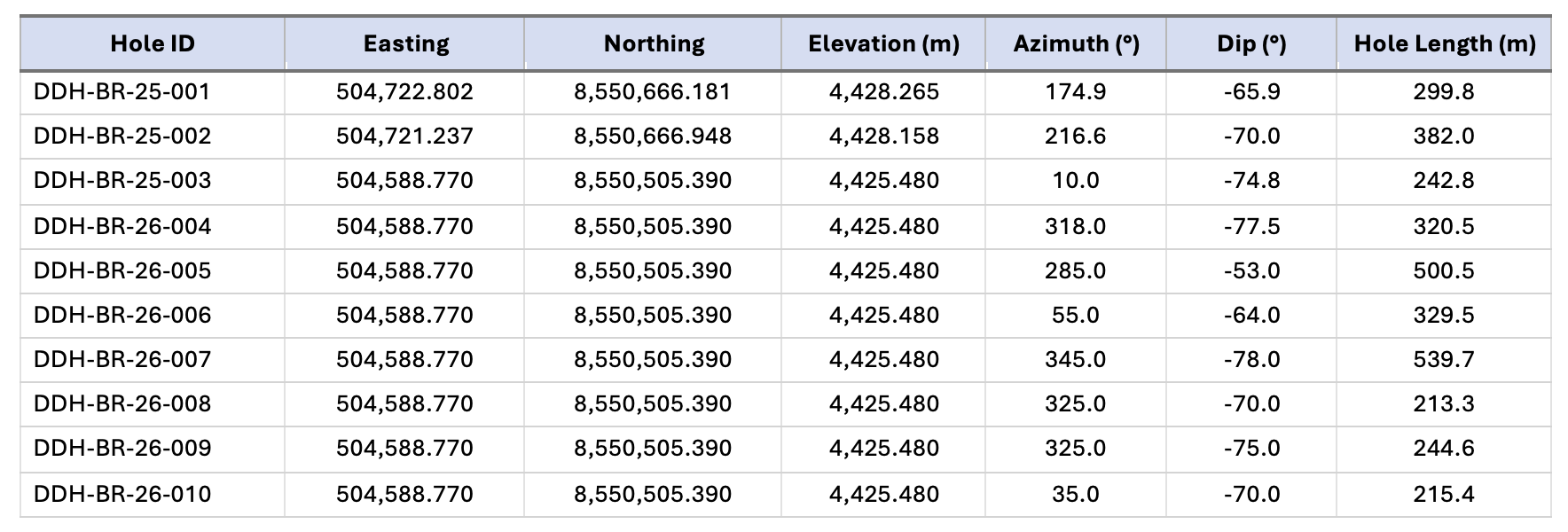 Drill hole collar locations and orientation parameters for the holes referenced in this release are provided in Table 1.