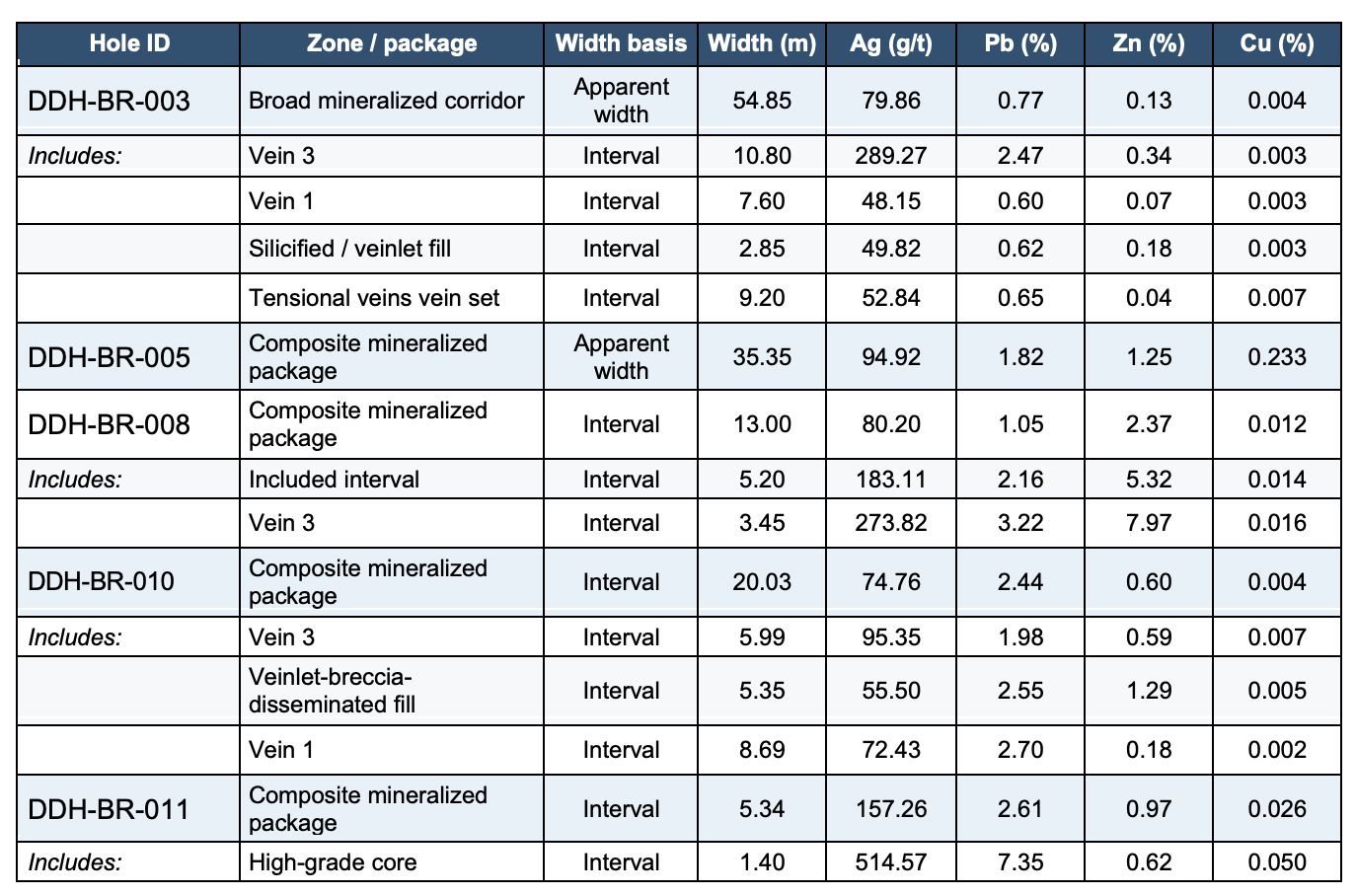 Note: “Composite package” refers to the combined interval formed by the two principal veins and the intervening mineralized fill where these can be recognized within the drill intercept. Rows labelled “Including” denote internal higher-grade or discrete component intervals within the broader intercept. DDH-BR-004 intercepted an extension of a barren post-mineral dyke and is not included in this table.
