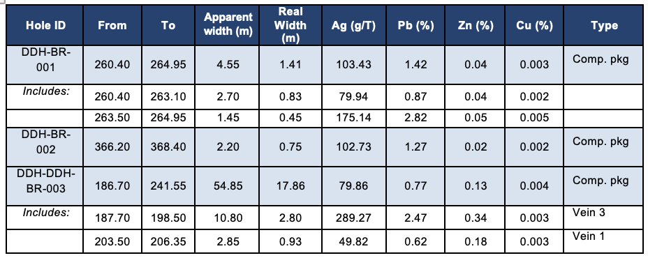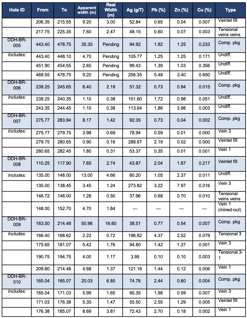- DDH-BR-005 was drilled well away from the main drill pattern. Because the local orientation of the vein system at the intercept point is not yet sufficiently constrained, only apparent width is reported for that hole at this stage.