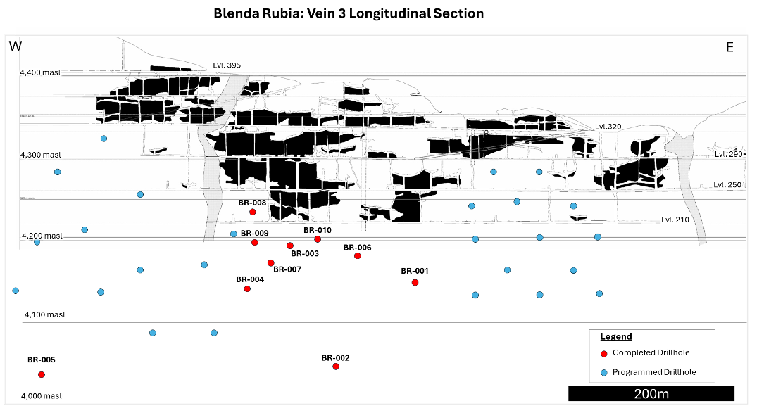 The current geological model indicates that Blenda Rubia is controlled by two principal veins, Vein 1 and Vein 3, which locally converge and diverge along strike and at depth.