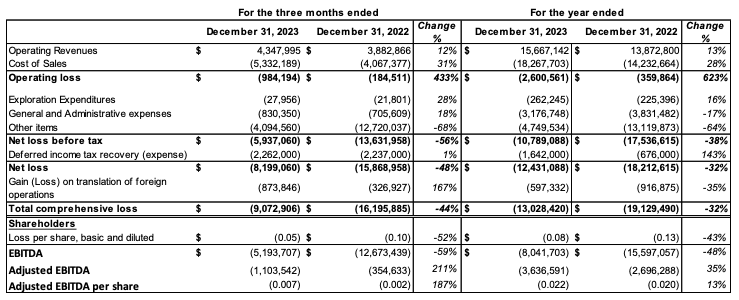 - Generated revenues of $4.3 million in Q4 2023, representing a 12 per cent increase when compared to $3.9 million of revenues in Q4 2022. This is reflective of the successful ramp up since the operational pause and upgrades during the third quarter of 2023.