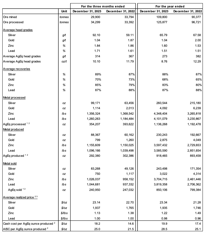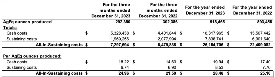 - Q4 2023 Cash costs of $18.22 per Silver Equivalent (“AgEq”) ounce produced (1)(2) and All-In-Sustaining Cost (“AISC”) (1)(2) of $24.96 per AgEq ounce produced, reflective of the sustaining capital expenditure invested in the development of the Tangana mining unit ($2.0 million adding $6.74 per AgEq ounce produced to the AISC).