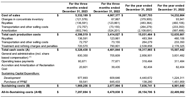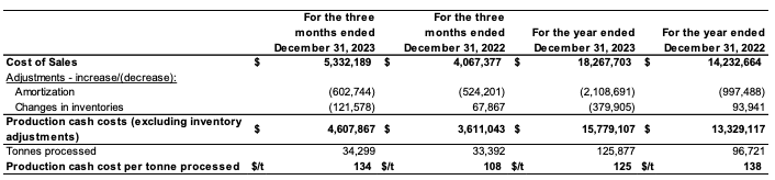 A reconciliation between production cost per tonne (excluding amortization and changes in inventories) and the cost of sales is provided below. Changes in inventories are excluded from the calculation of Production Cost per Tonne Processed. Changes in inventories reflect the net cost of concentrate inventory (i) sold during the current period but produced in a previous period or (ii) produced but not sold in the current period. The Company uses Production Cost Per Tonne Processed to evaluate its operating performance in addition to IFRS measure because Company believes that conventional measures of performance prepared in accordance with IFRS do not fully illustrate the ability of its operations to generate cash flows. Management and certain investors also use this information to evaluate the Company’s performance relative to peers who present this measure on a similar basis.