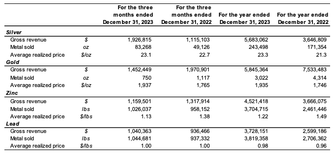 Average realized price is a non-IFRS financial measure. The Company uses “average realized price per ounce of silver”, “average realized price per ounce of gold”, “average realized price per ounce of zinc” and “average realized price per ounce of lead” because it understands that in addition to conventional measures prepared in accordance with IFRS, certain investors and analysts use this information to evaluate the Company’s performance as compared with “average market prices” of metals for the period.